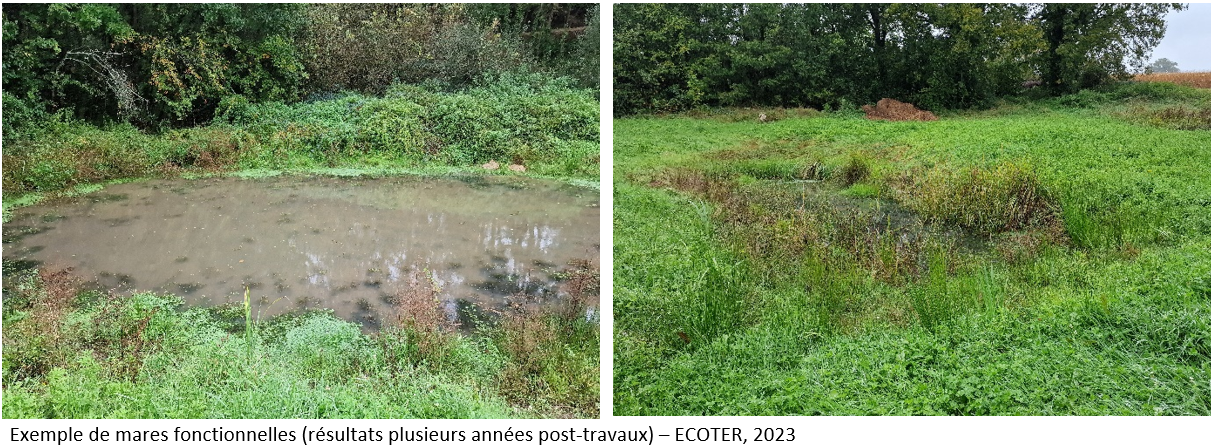 Même de taille réduite, les mares peuvent rassembler une richesse extraordinaire. Les mares sont particulièrement cruciales pour les amphibiens (crapauds, grenouilles, tritons, salamandres), car elles sont essentielles pour leur reproduction. Les œufs et les larves d’amphibiens se développent dans l’eau et les mares fournissent un environnement idéal pour leur croissance. De plus, elles offrent une source de nourriture abondante pour les amphibiens adultes, contribuant ainsi à leur survie. Les libellules, oiseaux, insectes pollinisateurs et plantes aquatiques y trouvent aussi abri et nourriture.