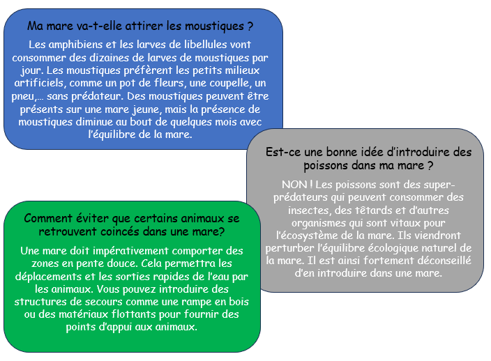 A savoir : La pêche, le transport et l’introduction des amphibiens dans une mare sont interdits : les amphibiens sont avant tout des animaux terrestres et ils viendront coloniser naturellement la mare.