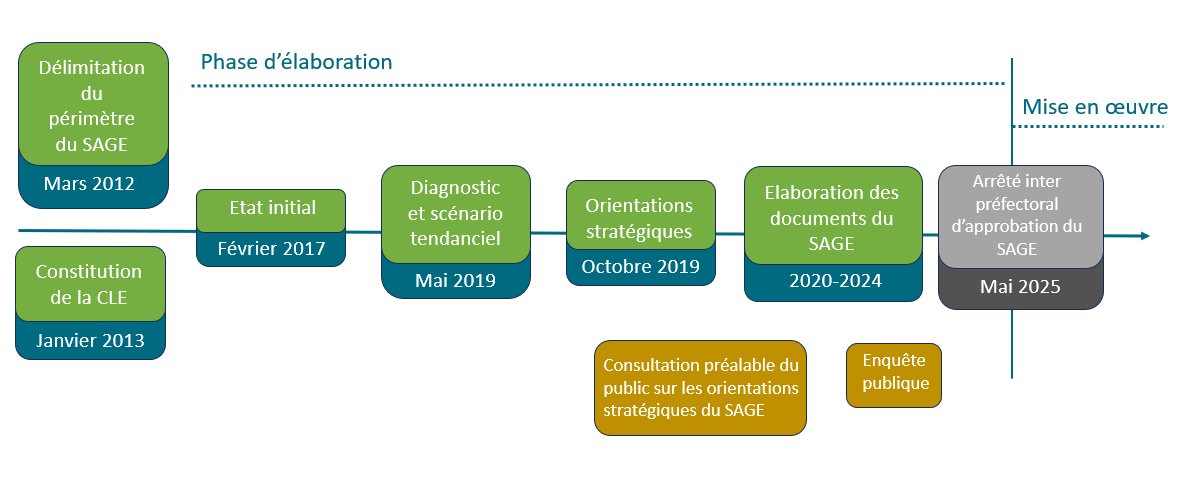 Le processus de construction du SAGE a nécessité une dizaine d'années pour aboutir les 21 et 28 mai 2025 à la signature de l'arrêté interprefectoral d'approbation du SAGE par les Préfets de la Drôme et du Vaucluse.